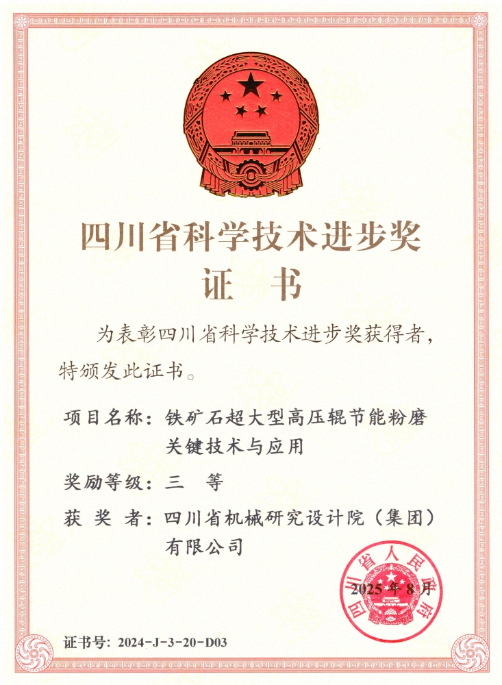 近日,2024年度四川省科學(xué)技術(shù)獎勵大會在成都舉行,川機集團參與的“電子裝聯(lián)關(guān)鍵精密件數(shù)智化制造技術(shù)及應(yīng)用”項目和“鐵礦石超大型高壓輥節(jié)能粉磨關(guān)鍵技術(shù)與應(yīng)用”項...